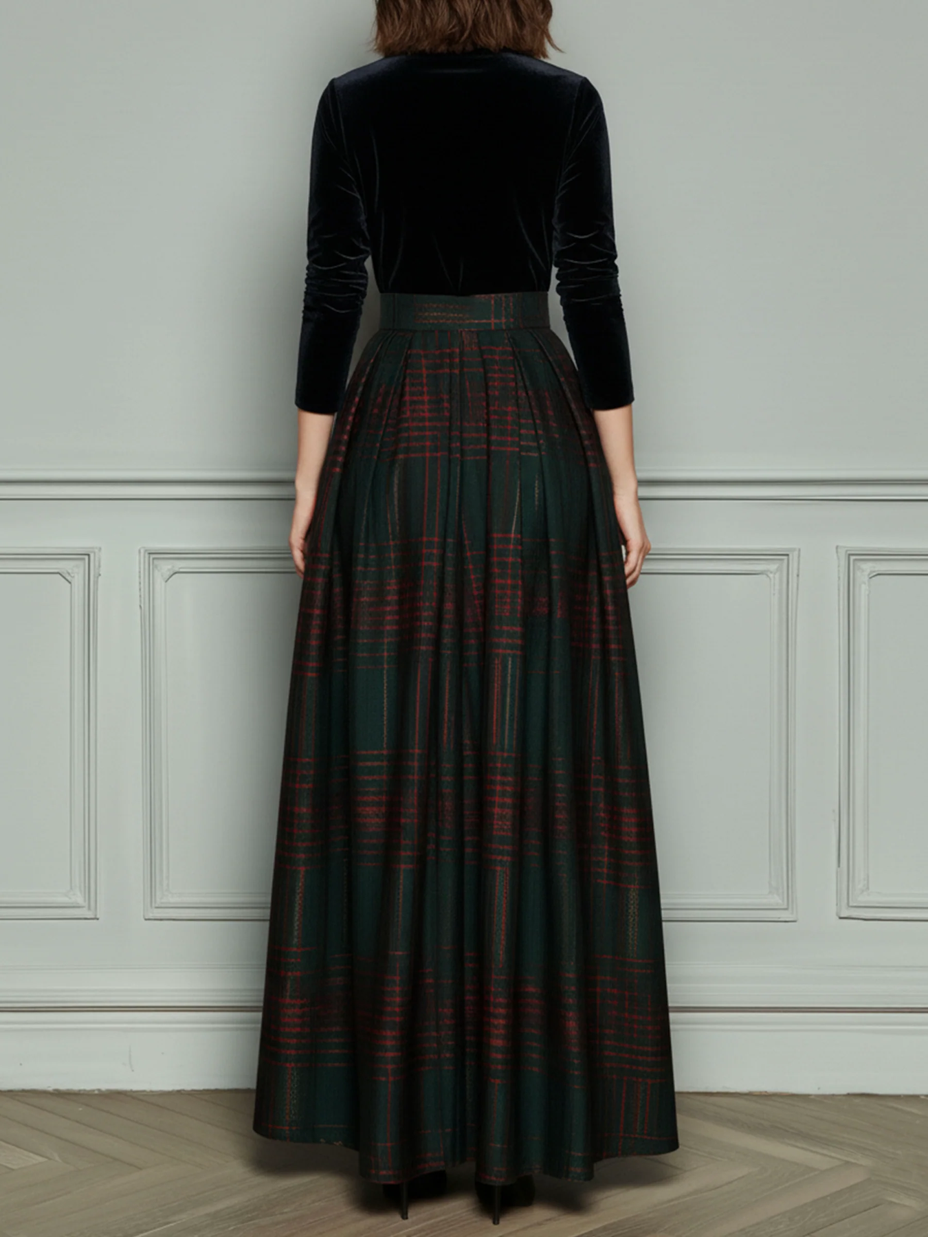 Discover timeless elegance with our Elegant High Waist Velvet and Plaid Evening Gown. This luxurious gown combines the rich texture of velvet with a classic plaid design, creating a sophisticated and unique look. The high waistline accentuates your figure, while the full skirt gracefully drapes, making it perfect for formal occasions or evening events.